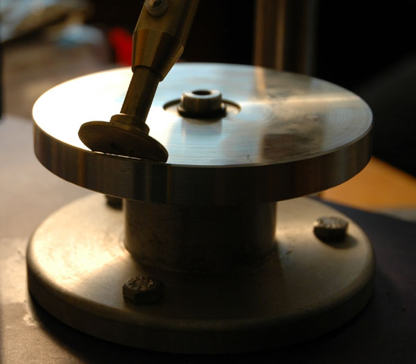 The simplest way of doing this is setting the angle of the Faceting Head to around 70 degrees, so it’s almost horizontal. Put the large dop in the Quill and the flattest lap you own on the Platen. In my case I have an old ceramic lap that I used on my MDR faceting machine, which I know is as flat as I can hope to get.